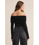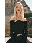 This off-shoulder top blends sheer mesh with flocked dots for an elevated, feminine look. The fitted silhouette feels lightweight and flattering, whether paired with denim or something dressier.